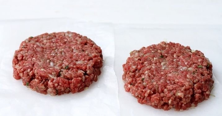 - Die „Fleischhügel“ wieder mit Butterpapier (am besten individuelle Stücke) bedecken und mit einem Teller auf rund 2 -2,5cm Höhe und 12 cm Durchmesser flachdrücken. Sollten die Ränder eher lose sein, diese etwas andrücken, damit das Laibchen beim Anbraten nicht auseinander fällt. Zu dünne Patties eignen sich nicht für den Grill und brechen oft beim Wenden.